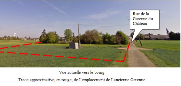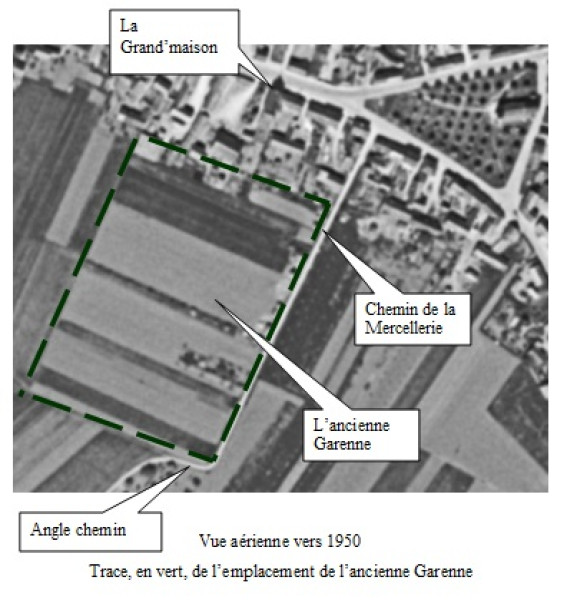 La garenne était un petit bois créé par un seigneur de Charsonville (avant De Croisilles), de forme rectangulaire. Il était entouré d’un mur en pierre. Dans deux angles de ce rectangle on avait construit des petites tours carrées coiffées d’un toit. Le bois s’arrêtait au chemin « de Charsonville à la Mercellerie », lequel faisait un angle droit à cet endroit. Angle droit qui était toujours visible sur le plan ci-dessous de 1830 et la vue aérienne de 1950 (avant le remembrement de 1970).