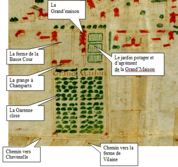 D’après le plan ci-dessous de 1670, il semble que l’entrée principale à la Garenne s’effectuait par le côté de la cour de la Grand’maison.