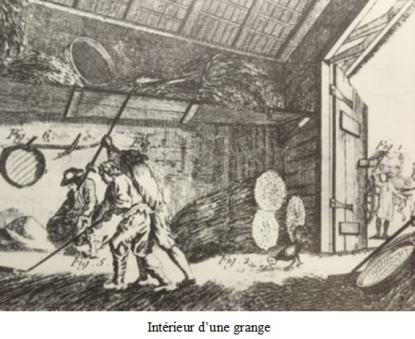Autour de cette grande cour, deux grandes granges avec toits couverts de tuiles étaient là pour abriter une partie de la paille et pour battre les « bleds » (voir photo ci-dessous).