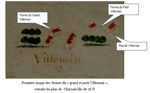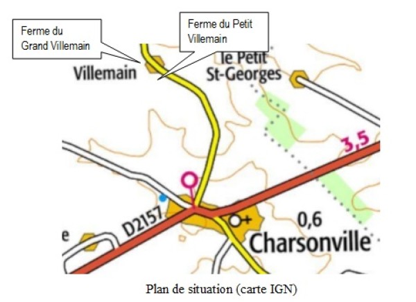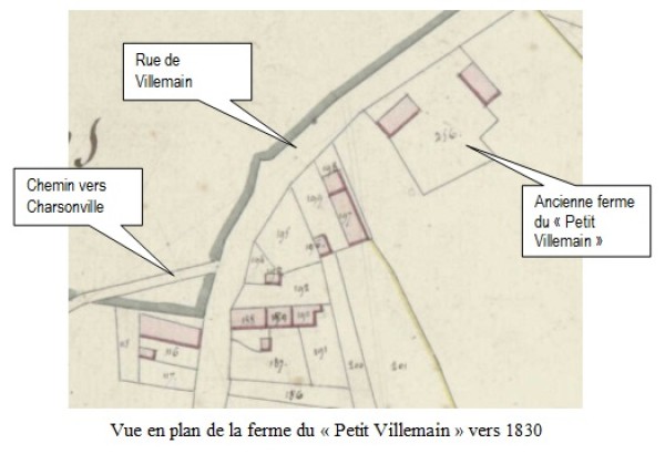 Autrefois (avant le 19ème siècle), dans le hameau de Villemain, situé au nord de la commune de Charsonville, il existait deux fermes appelées « Le Grand et le Petit Villemain » ou « la Grande et la Petite Métairie de Villemain ». Ces deux fermes appartenaient à la Seigneurie de Villemain et au seigneur de Charsonville. Aujourd’hui, la ferme appelée le « Grand Villemain » existe encore mais elle a perdu son ancien nom. Cette grande ferme (11 rue de Villemain) appartient maintenant à la famille Pointeau. La ferme du « Petit Villemain » n’existe plus et je ne connais pas la date de sa disparition. Elle était située en face de celle du « Grand Villemain ».