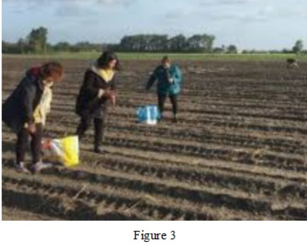 Mais notons que le glanage, qui avait disparu de notre région de Loire-Beauce depuis 60 ans, se pratique de nouveau aujourd’hui. En effet, on voit de plus en plus, dans les champs, après que l’agriculteur ait effectué sa récolte, des glaneuses et glaneurs (voir figure 3 ci-dessous), en journée, venir ramasser, le plus souvent en famille, des pommes de terre, des oignons, des échalotes, ….. et ceci pour leurs consommations personnelles. On rencontre également le « glaneur urbain » sur les marchés, mais on ne voit plus de glaneurs de blé ni de maïs pour nourrir les poules… !