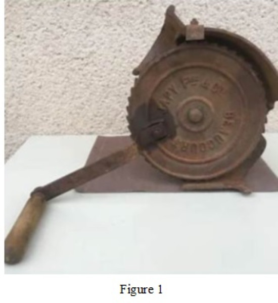 Après le séchage du maïs, qui durait tout l’hiver, nous égrenions les pommes de maïs à la main ou avec un égreneur à manivelle (voir figure 1 ci-dessous).