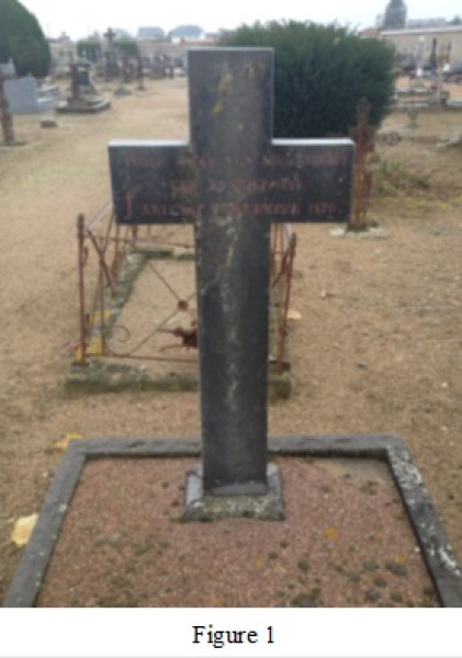 Après la guerre, l’emplacement de sa sépulture, dans le cimetière, fut acheté par l’Ambassade d’Allemagne le 26 janvier 1874 et à la tête du monument funéraire il fut plantée une croix en granit portant cette inscription en rouge (voir figure 2 ci-dessous) :