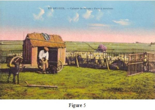 « Le berger, pour avoir un peu d’ombre, s’était assis contre la cabane à deux roues, qu’il poussait à chaque déplacement du parc, une étroite niche qui lui servait de lit, d’armoire et de garde manger…… Dans les grands chaumes, le parc voyageait, ne restait guère plus de deux ou trois jours à la même place, juste le temps laissé aux moutons de tondre les herbes folles ; et ce système avait en outre l’avantage de fumer les terres, morceau à morceau. Pendant que le berger, aidé de ses chiens, gardait le troupeau, les deux hommes et le petit porcher arrachèrent les crosses, transportèrent les claies à une cinquantaine de pas ; et, de nouveau, ils les fixèrent sur un vaste carré, où les bêtes vinrent se réfugier d’elles–mêmes, avant qu’il fut fermé complètement. ».