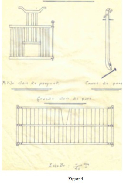 En été, les moutons étaient parqués à l’extérieur de la ferme. Le parc (voir figures 4 et 5 ci-dessous) se composait d'environ 70 claies de 2,65 m de longueur et 1,10 m de hauteur, maintenues par des crosses de 1,50 m de longueur. Une roulotte complétait ce matériel de parcage.