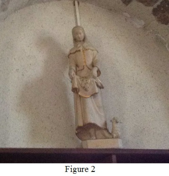 Mais une statue, dans l’église, rappelle l’époque passée de l’élevage intensif des moutons sur la commune de Charsonville. En effet, vous remarquerez en entrant dans l’église, juste au dessus de la porte principale, une statue en plâtre achetée après 1867 (date de sa canonisation), non peinte représentant Sainte Germaine Cousin (dite de Pibrac), jeune bergère décédée en 1601 et canonisée en 1867. La statue représente un mouton allongé à ses pieds et des fleurs disposées dans le tablier de Sainte Germaine, patronne des bergers et bergères (voir figure 2 ci-dessous).