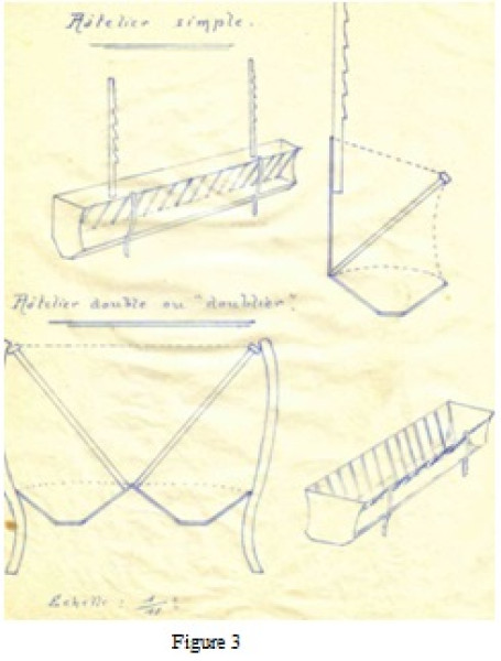 Il y avait des auges mobiles, à double côté, dites « doubliers » (voir figure 3 ci-dessous), que l'on pouvait disposer au milieu des bergeries.
